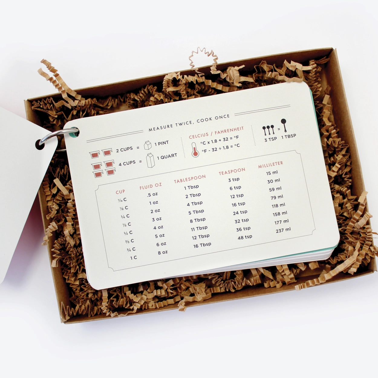 • Set of 24 recipe cards (4” x 6”) • 1 measurements guide • place setting guide • 3 dividing pages • mini pencil • packaged in a kraft paper box with a clear cover • Sustainably made in the USA. Introducing a sweet ring of 24 vintage-inspired recipe cards measuring at 4" x 6". With a silver foil cover, this ring is as charming as it is functional! Inside, 24 recipe cards are divided into three sections, with a helpful measurement conversion guide and place setting guide. This is perfect for holiday cookie exchanges, or for storing your family's favorite recipes for the season.